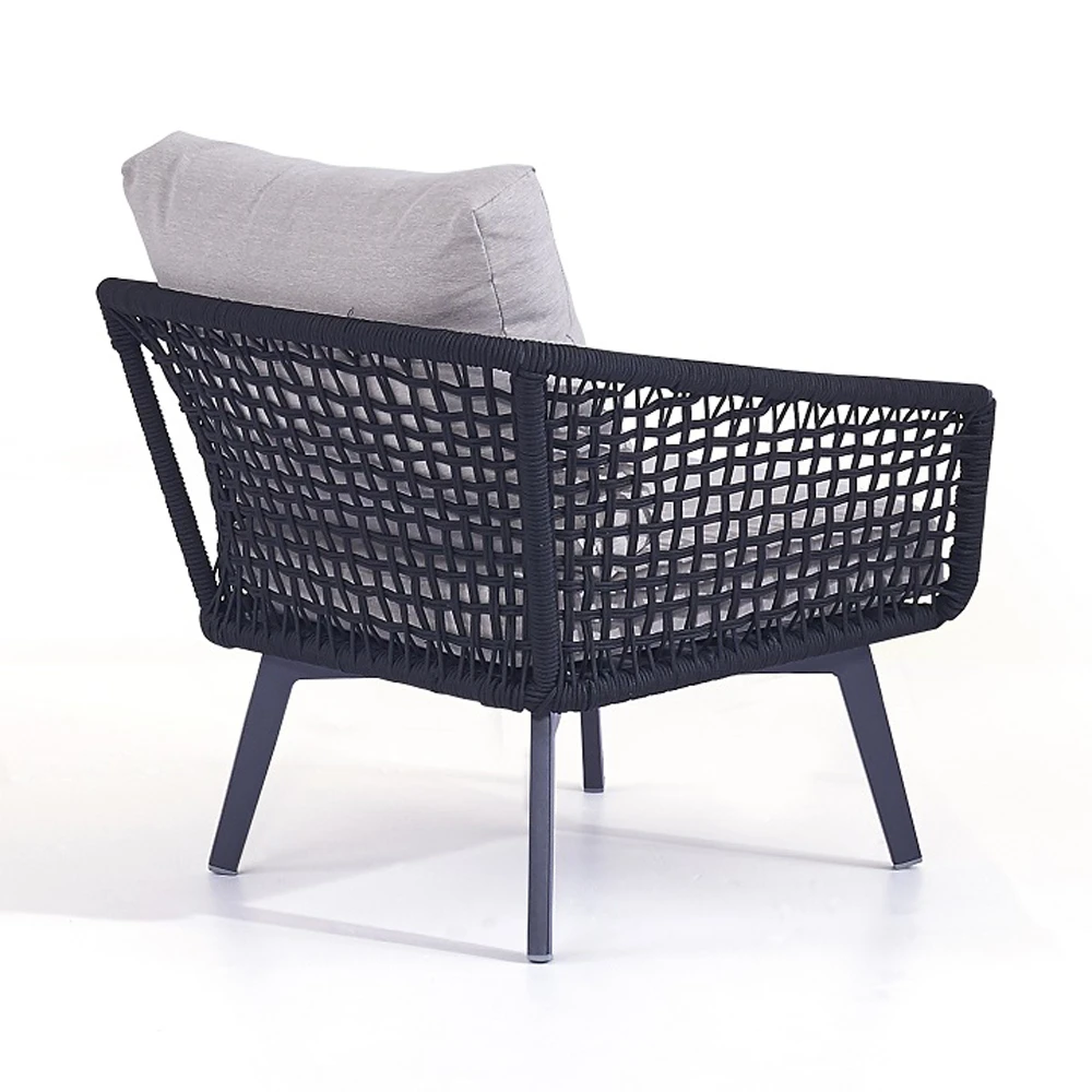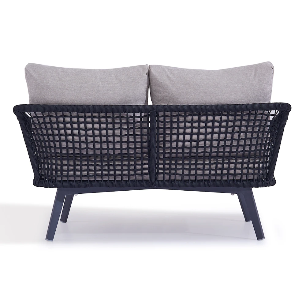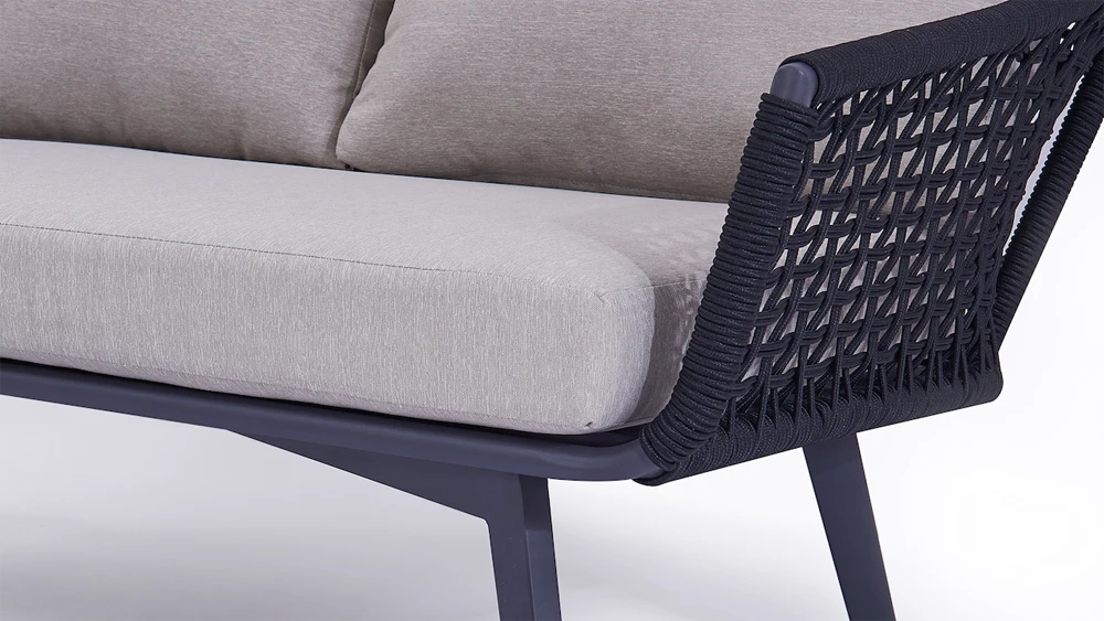 De Barcelona zitgroep uit onze nieuwe collectie is een echte eyecatcher. Rope stof is samengeweven op een aluminium frame om een uniek patroon te creëren. De elementen van deze collectie zien er licht en luchtig uit, maar de banden zitten stevig vast aan het frame. De ergonomisch ronde rugleuning biedt absoluut comfort. Zit- en rugbekleding zijn voorzien van hoogwaardige Olefin hoezen, de buiteneigenschappen van alle materialen zijn optimaal voor tuinmeubelen. De mooie combinatie van zwarte stoffen banden, de matte poedercoating van het frame in antraciet en de dikke stoffering in steengrijs geven de meubels in deze set een moderne en elegante uitstraling. Met de 2 fauteuils, de tweepersoonsbank en de bijpassende salontafel kan de zomer alleen maar mooi zijn!