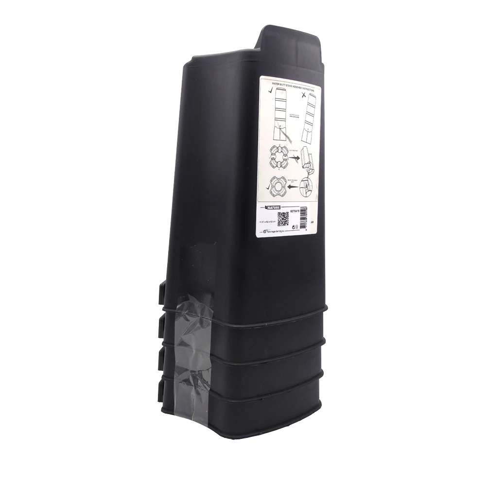 Standaard gemaakt van zwarte kunststof om de regenton muurmodel 100 L hoger te kunnen plaatsen. Vergemakkelijkt het vullen van bijvoorbeeld gieters bij de kraan. Afmeting: H 31 cm x 42 x 42 cm.